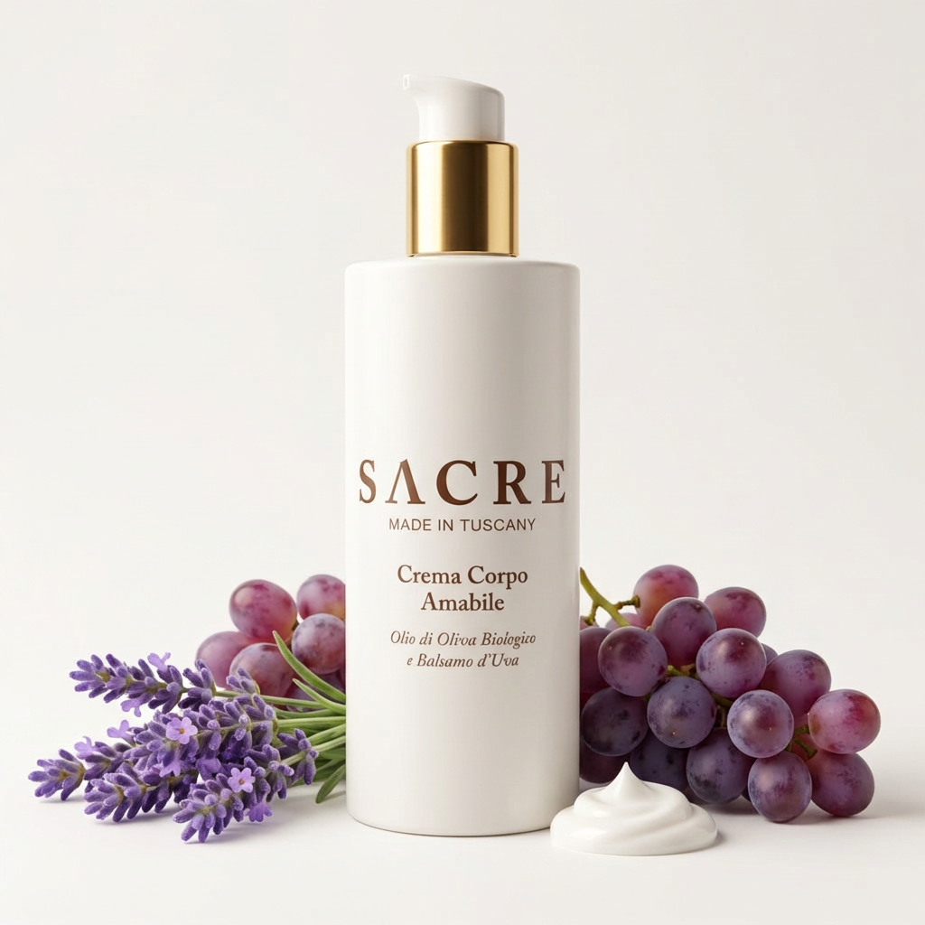 Crema corpo multifunzione a base di Linfa di Vite e Balsamo d’Uva di Modena, arricchita con Olio Extravergine di Oliva Bio Toscano e Olio Essenziale di Lavanda Officinalis dell’Azienda Agricola Aia del Tufo di Sorano, in provincia di Grosseto.